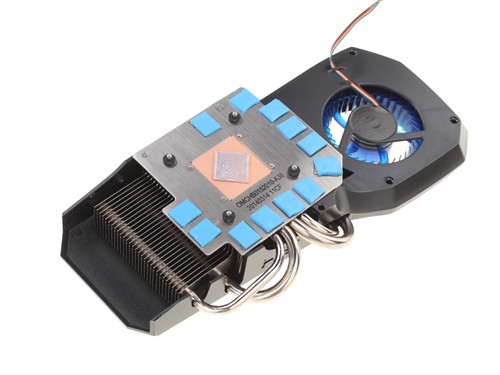 作为涡轮散热器,散热鳍片一般都不会很大,但是通常都很厚实,这款显卡在散热鳍片方面的用料没有忽视,铝制显存散热片下方便是纯铜导热板,配合两粗两细的导热管,有效地传递了核心的热量,导热效果出色,不过热管方面,两跟粗热管十分不错,用料十足,但是两根细的就有点寒酸了,真得很细。